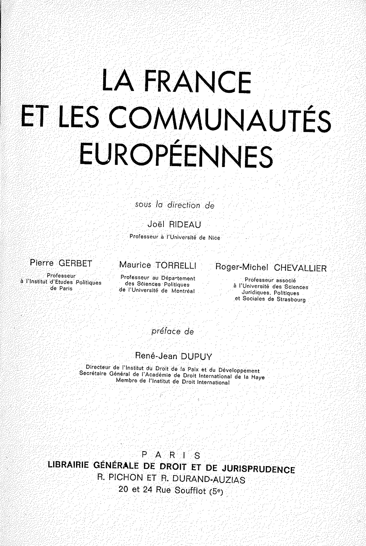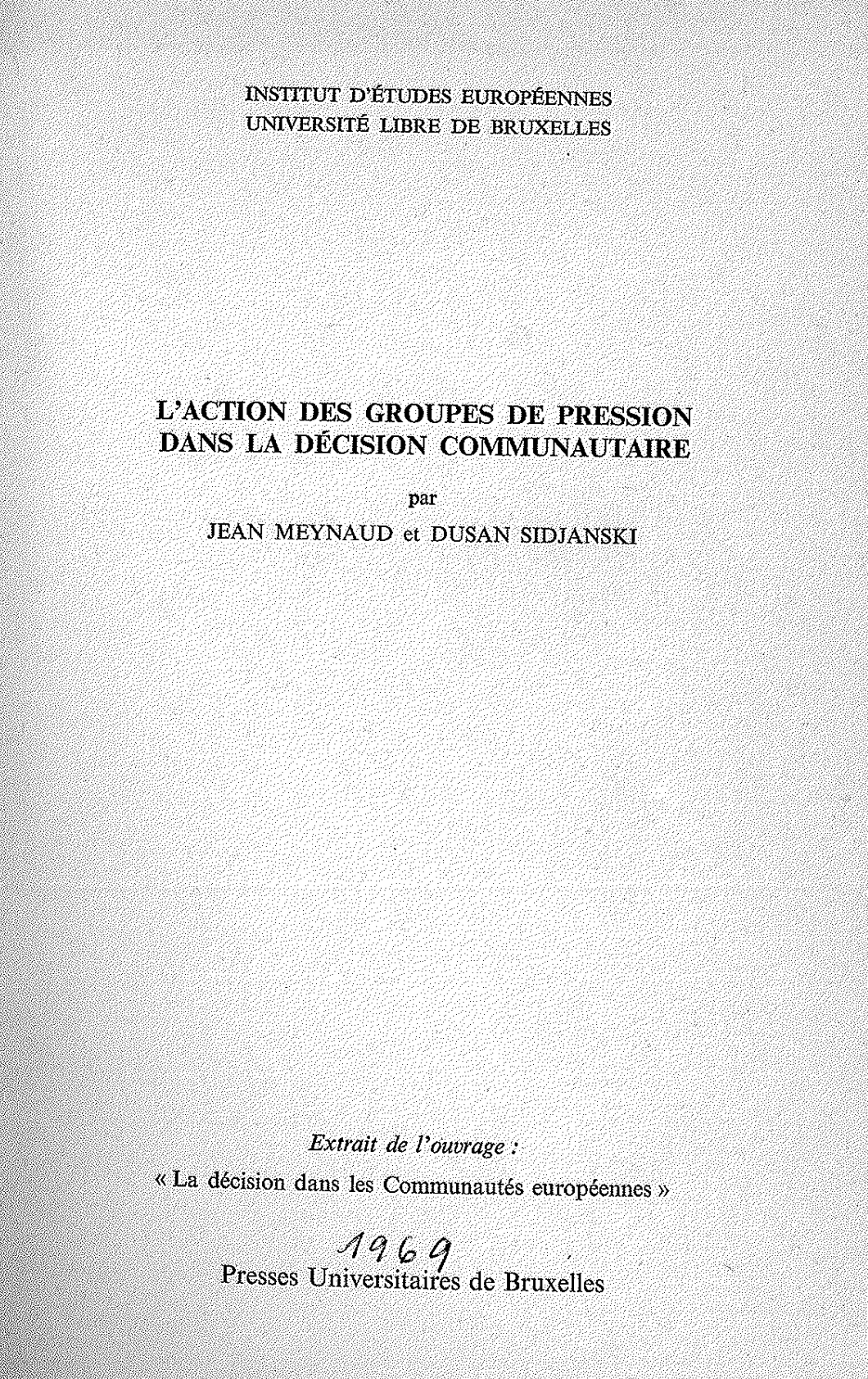 “Action des groupes de pression dans la Communauté européenne , (en coll. avec J. Meynaud), in GERBET, P. et PEPY, D. (dir.), La décision dans les Communautés européennes, Bruxelles, Presses universitaires de Bruxelles, 1969, pp. 133-148.