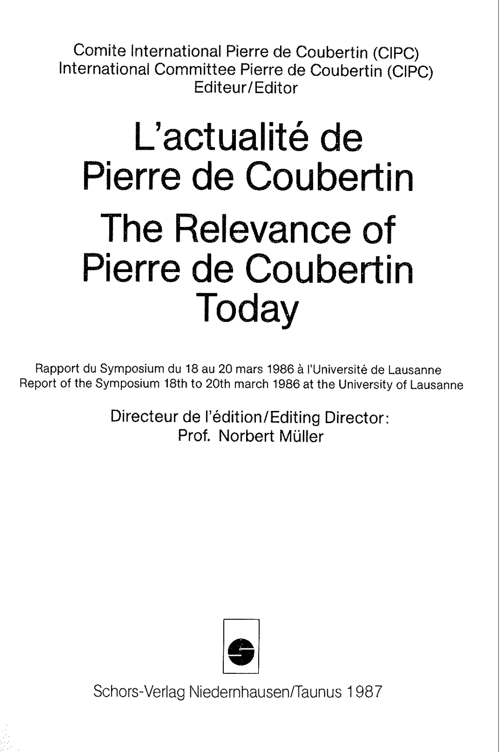 « Le sport et la politique » , in MÜLLER, N. (dir.), L'actualité de Pierre de Coubertin, Niedernhausen/Taunus, Schors-Verlag, 1987, pp. 245-254.