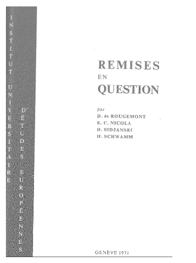 « Une Communauté élargie avec l’Angleterre et sans les Anglais? » , in DE ROUGEMONT, D. et al. (dir.), Remises en question, IUEE, Genève, 1971, pp. 25-34.