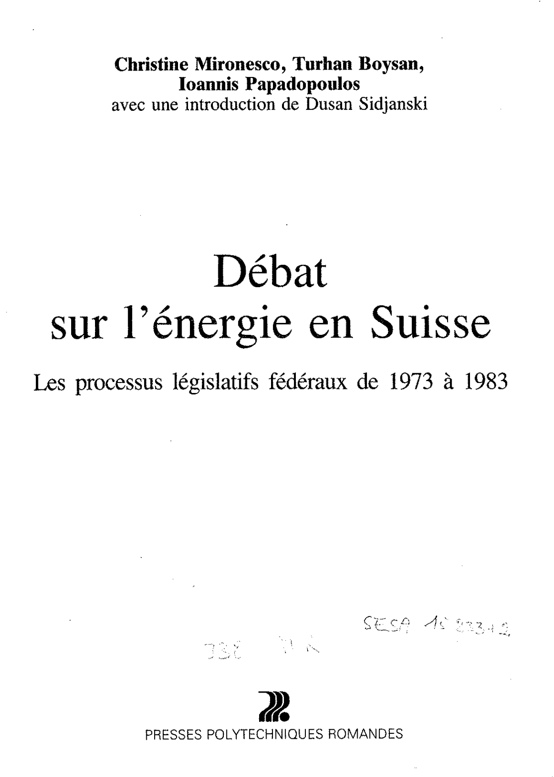« Introduction » , in MIRONESCO, Ch. et al. (dir.), Débat sur l'énergie en Suisse, Les processus législatifs fédéraux de 1973 à 1983, Lausanne, Presses Polytechniques Romandes, 1986, pp. 1-5.