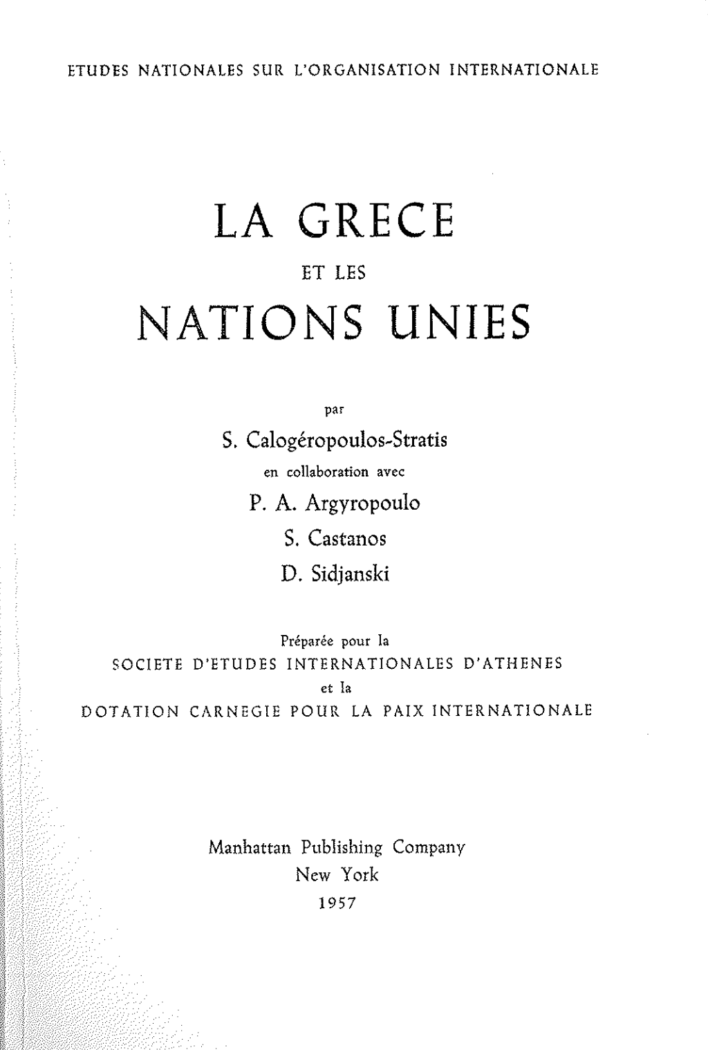 « Structure organique de l’O.N.U. et maintien de la paix » , in CALOGÉROPOULOS-STRATIS, S., ARGYROPOULO, P.A., CASTANOS, S. et SIDJANSKI, D., La Grèce et les Nations Unies, New York, Manhattan Publishing Company, 1957, pp. 74-104.