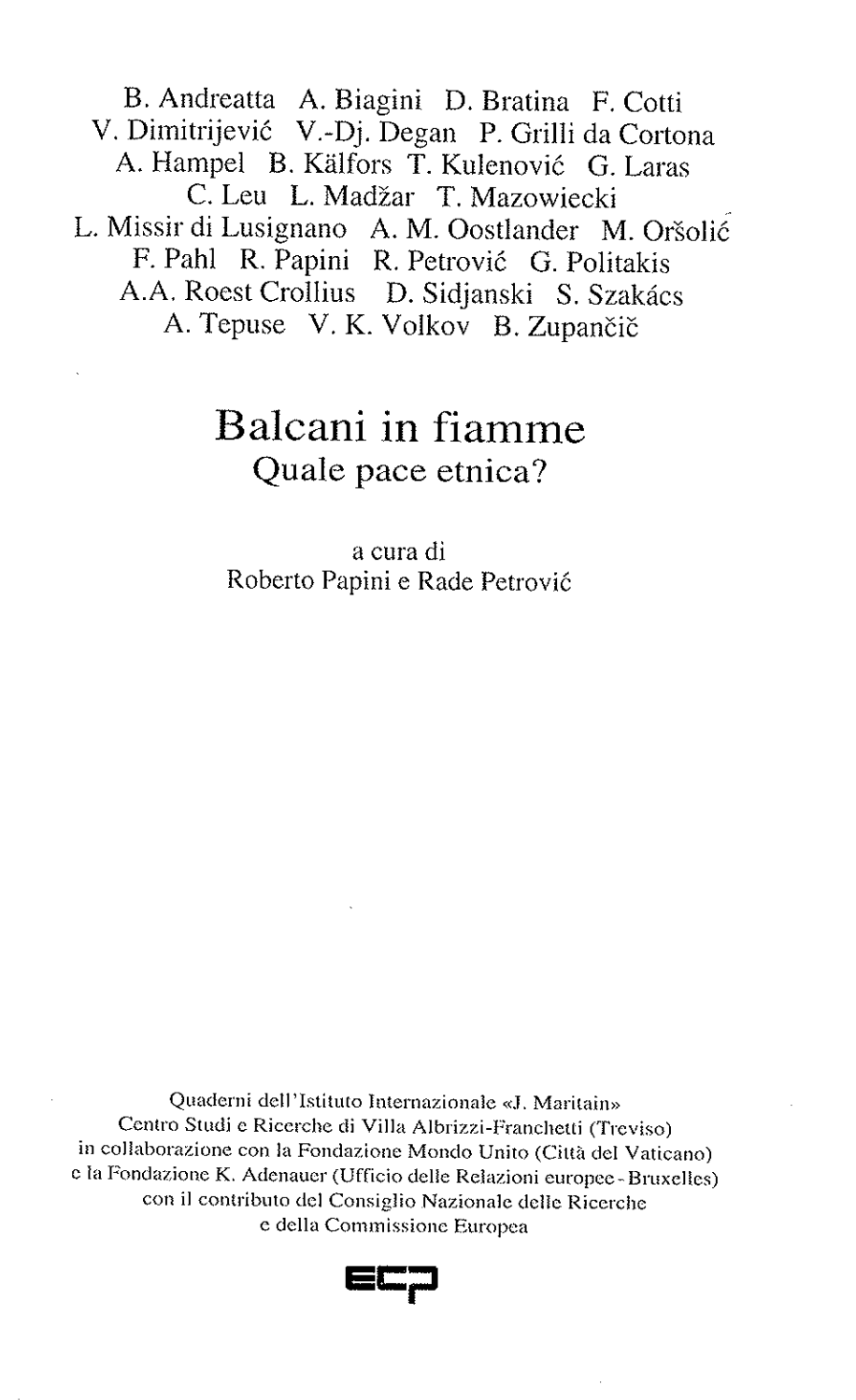 « Modelli di pace etnica. La Svizzera e l'Unione Europea: due casi d'integrazione » , in PAPINI, R. et PETROVIC, R. (dir.), Balcani in fiamme. Quale pace etnica?, San Domenico di Fiesole, Edizioni Cultura della Pace, 1995, pp. 192-200.